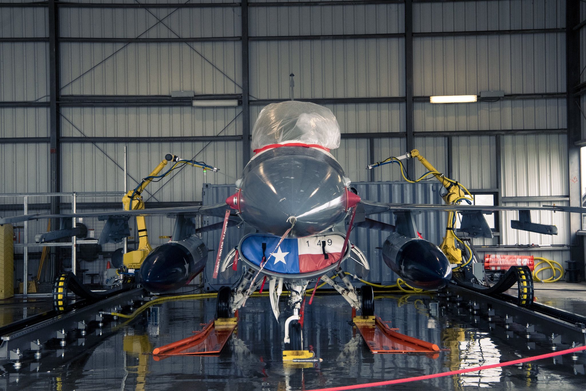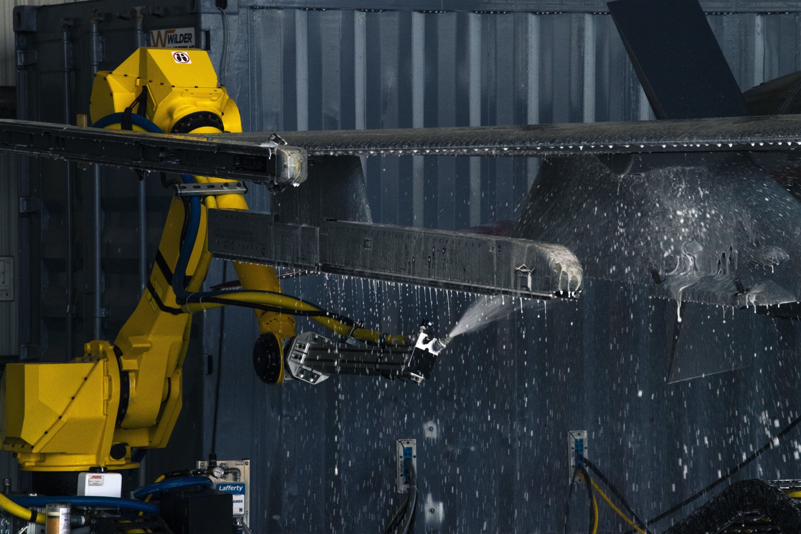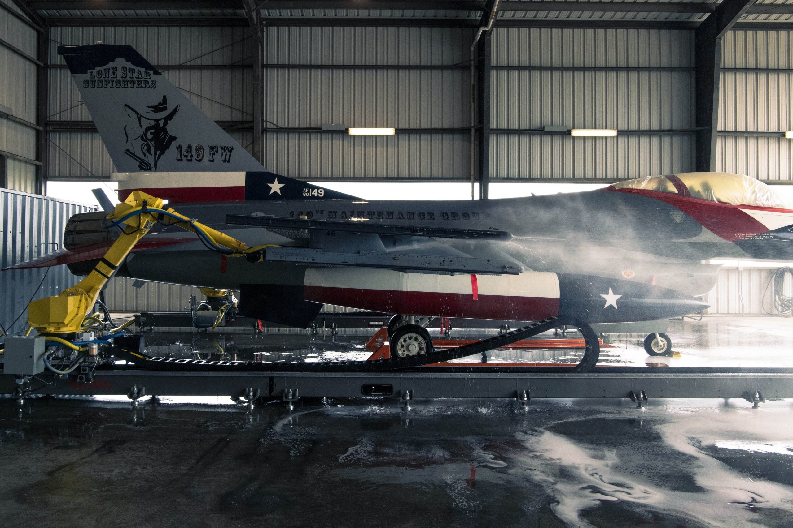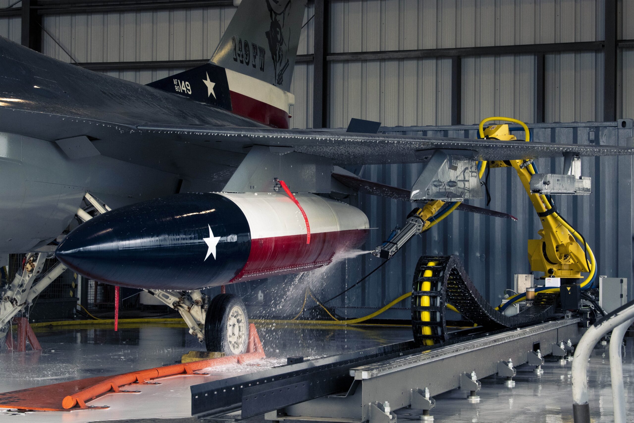 Σε μια ώρα μόλις τελειώνει το εξωτερικό πλύσιμο ενός F-16 το ρομποτικό σύστημα που δοκιμάστηκε στην βάση San Antonio-Lackland στο Τέξας. Συγκριτικά το πλύσιμο από ένα συνεργείο τεχνικών θα κρατούσε δύο μέρες για το ίδιο αποτέλεσμα.
