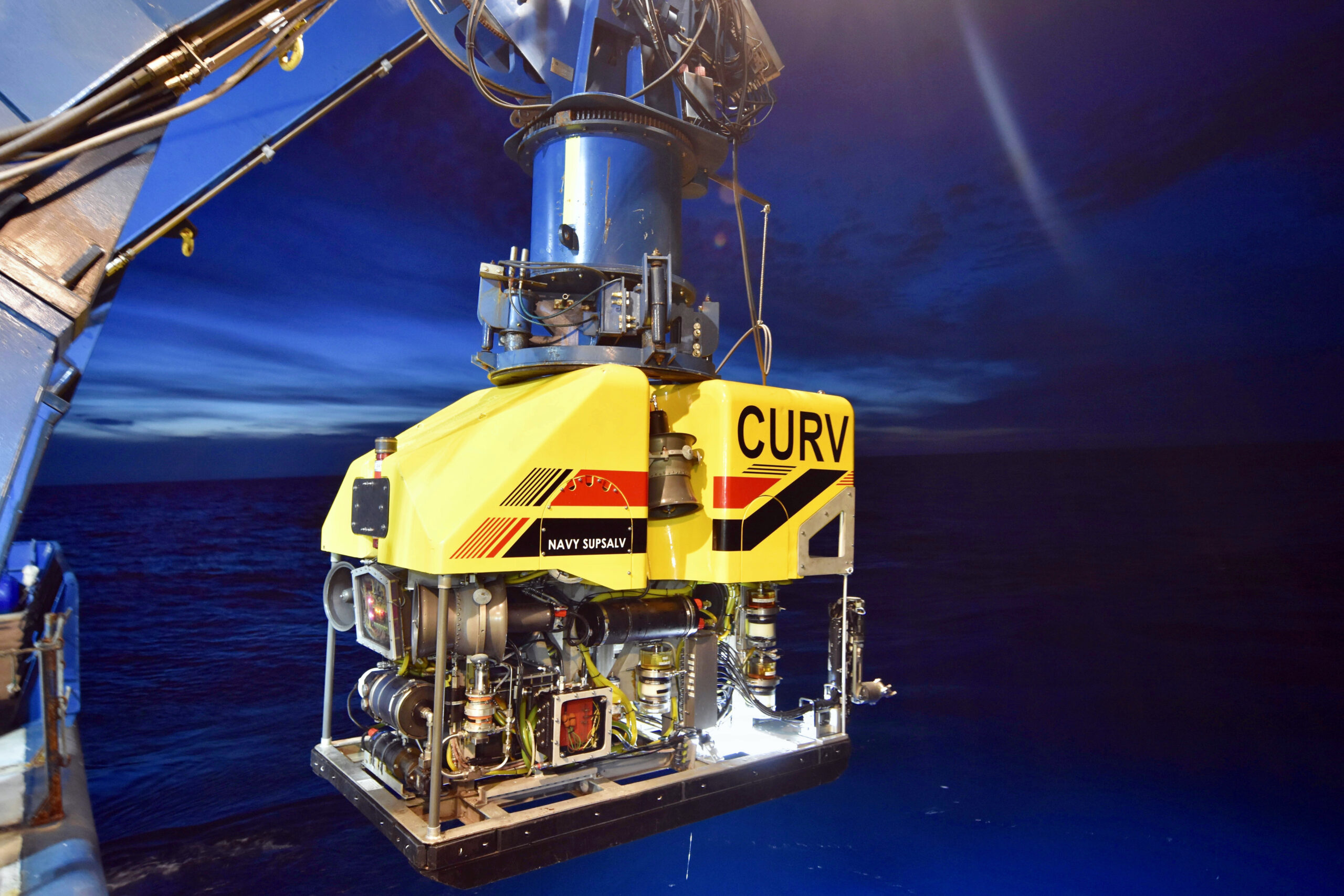 The R/V Atlantis, a U.S. Navy owned research vessel, deploys the cable-controlled Undersea Recovery Vehicle (CURV-21) off the coast of Comodoro Rivadavia, Argentina. The CURV is designed to meet the U.S. Navy’s deep ocean recovery requirements down to a maximum depth of 20,000 feet, and is being used to support the Argentine Navy’s search for the ARA San Juan (S-42) (U.S. Navy photo by Lt. Alex Cornell du Houx/Released).