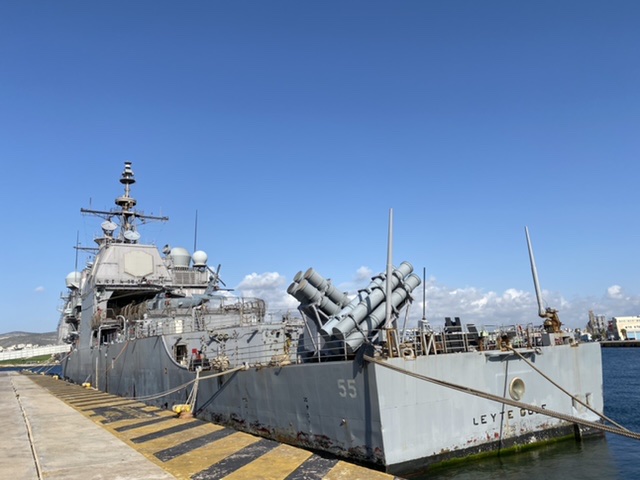 H ΠΤΗΣΗ βρέθηκε πριν από λίγες ώρες στο κατάστρωμα του καταδρομικού κλάσης Ticonderoga, CG-55 USS Leyte Gulf. Το καταδρομικό, που μπήκε σε υπηρεσία πριν 32 χρόνια (1987!), ήρθε στο λιμάνι του Πειραιά για 4ήμερη επίσκεψη, και η ΠΤΗΣΗ ήταν εκεί, καθώς θα δεν είναι πολύ εύκολο να δεις από τόσο κοντά ένα πανίσχυρο καταδρομικό του USN. Το πλοίο έχει συμπληρώσει 9,5 μήνες στη θάλασσα, κυρίως στον Περσικό Κόλπο, και το πλήρωμά του αισθανόταν ιδιαίτερη χαρά που επισκέπτονταν ένα φιλικό μέρος. Αυτός είναι και ο λόγος που το πλοίο φαίνεται κάπως “ταλαιπωρημένο”, καθώς η συνεχής παρουσία σε θερμές περιοχές δεν επιτρέπει εργασίες καλλωπισμού…