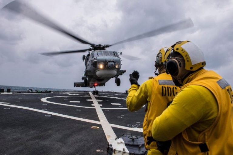 #Sailors signal to a Turkish navy SH-70 helicopter during deck landing qualifications aboard the #USSPorter (DDG 78) in the #MediterraneanSea #PartnershipsMatter #US6thFleet @USEmbassyTurkey pic.twitter.com/VIo8M0o2ql