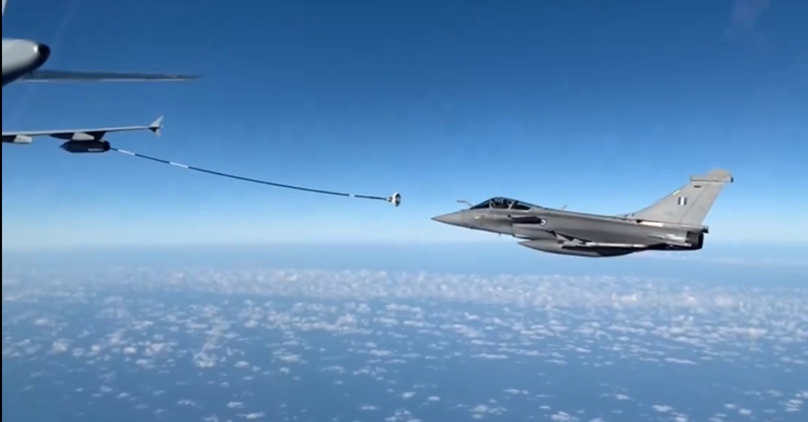 Βίντεο που αποδέσμευσε η Πολεμική Αεροπορία, δείχνει εναέριο ανεφοδιασμό ελληνικού Rafale EG από γαλλικό ιπτάμενο τάνκερ A330 Phenix, στο πλαίσιο της μεγάλης άσκησης Ramstein Flag 2024, που διεξάγεται στη χώρα μας από χθες.