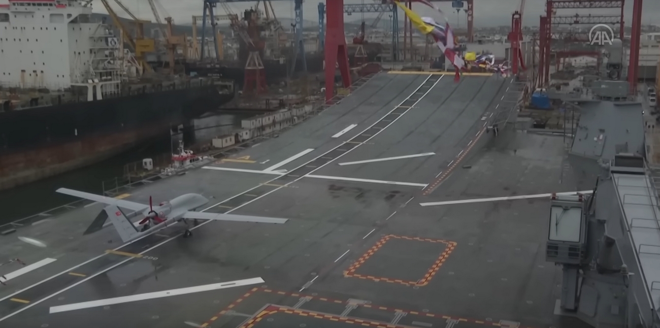 Στο βίντεο φαίνεται και ο Selcuk Bayraktar να υποδέχεται τον Ερντογάν και να τον ξεναγεί στα δύο μη επανδρωμένα που ήταν στο κατάστρωμα, ένα Βayraktar TB2 και ένα Kizilelma.