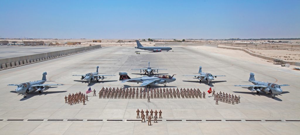 Ομαδική φωτογραφία του προσωπικού και των αεροσκαφών της VMAQ-2 του Σώματος των Πεζοναυτών στην Al Udeid Air Base, στο Κατάρ, της τελευταίας Μοίρας που αξιοποιεί EA-6B Prowler. Η μονάδα ολοκλήρωσε την τελευταία της ανάπτυξη και επιστρέφει στην έδρα της. Ταυτόχρονα ολοκληρώνεται και η καριέρα του αεροσκάφους ηλεκτρονικής κρούσης.