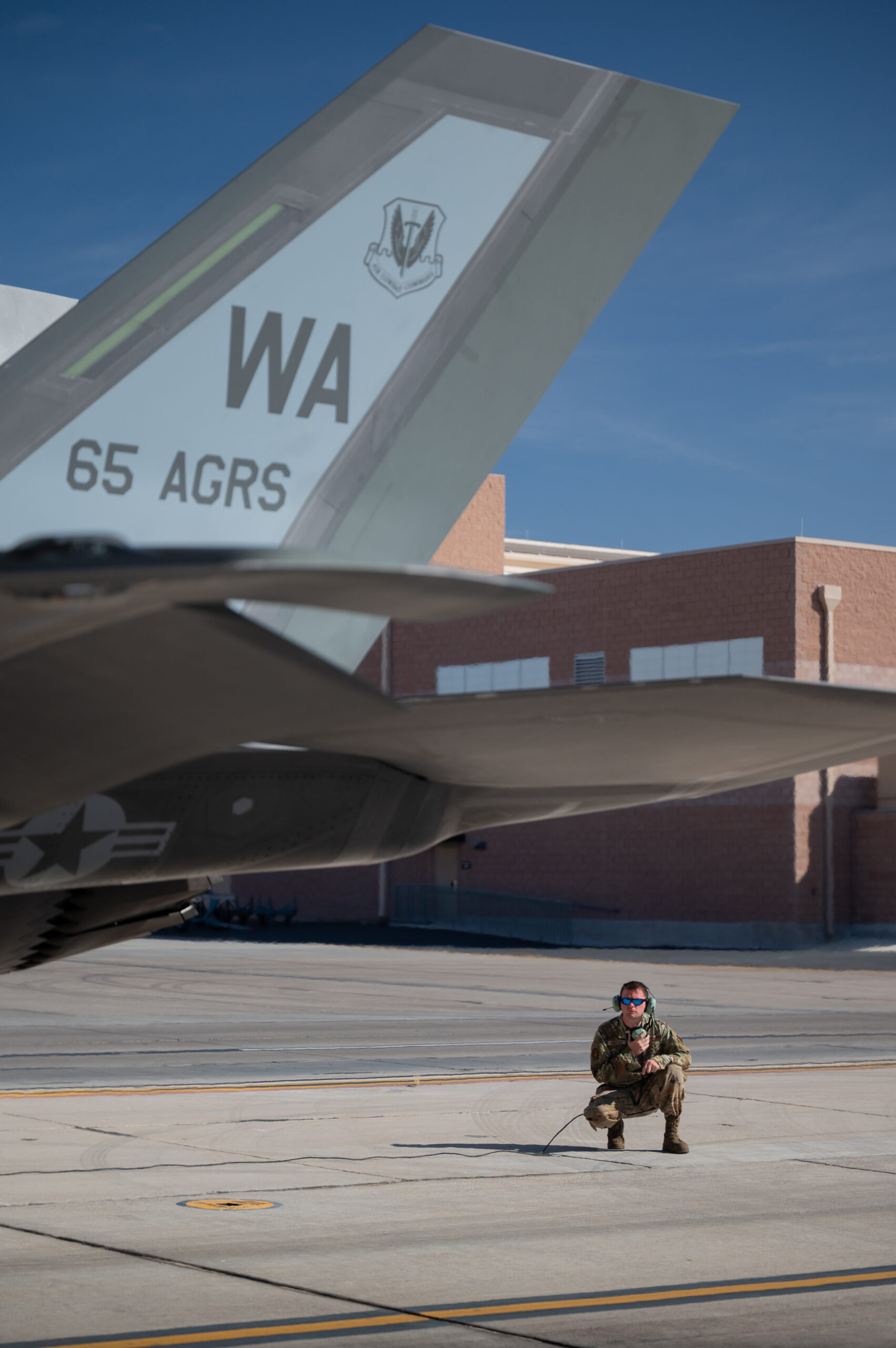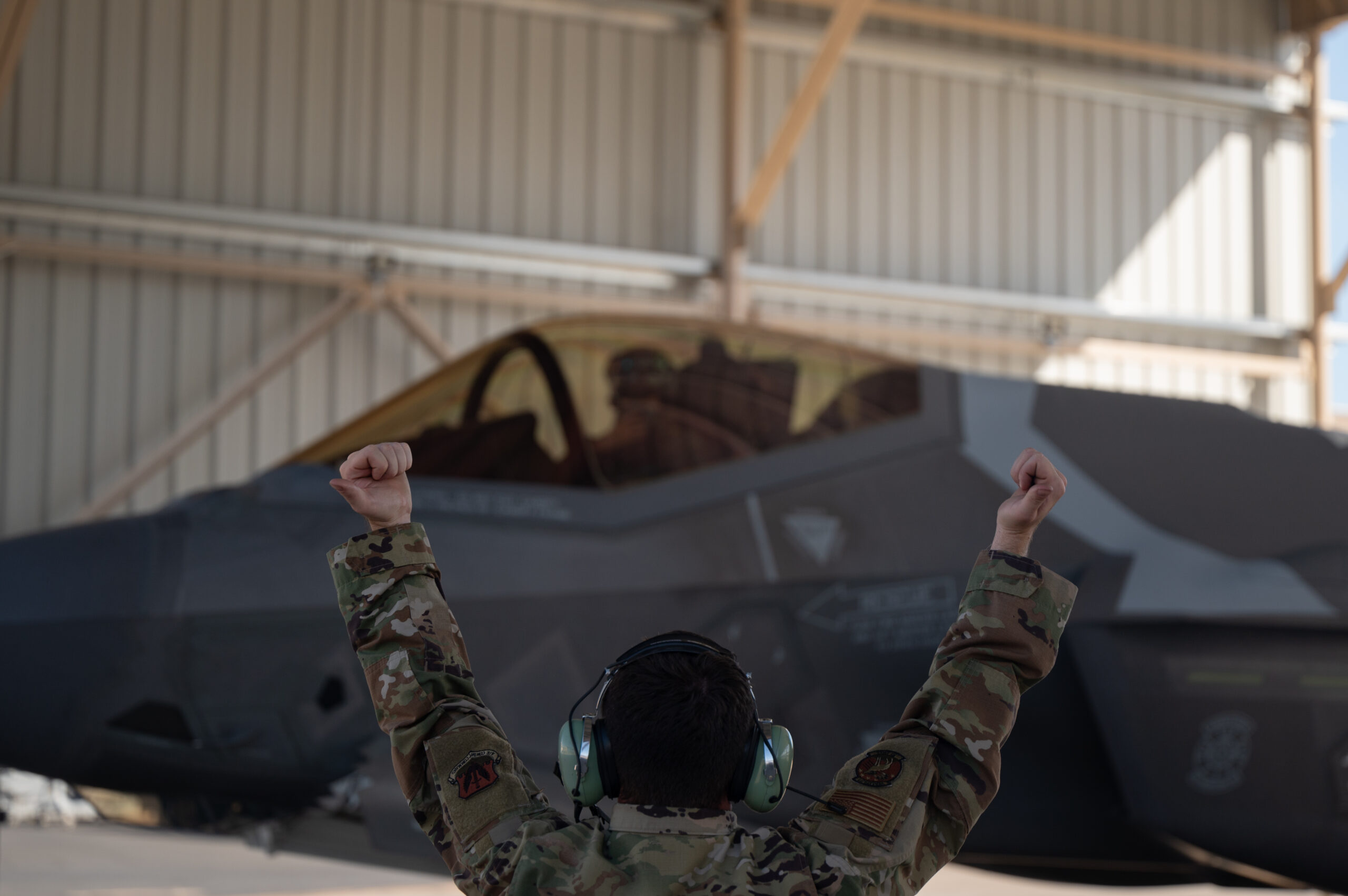 Senior Airman Hunter Rollins, a dedicated crew chief assigned to Lighting Aircraft Maintenance Unit, launches out an F-35A Lightning II, assigned to the 65th Aggressor Squadron, at Nellis Air Force Base, Nevada, June 9, 2022. The F-35s will be employed in large Combat Air Forces exercises, U.S. Air Force Weapons School missions, joint exercises, and operational test and evaluation events that are only conducted at Nellis Air Force Base and the Nevada Test and Training Range. (U.S. Air force photo by Senior Airman Zachary Rufus)