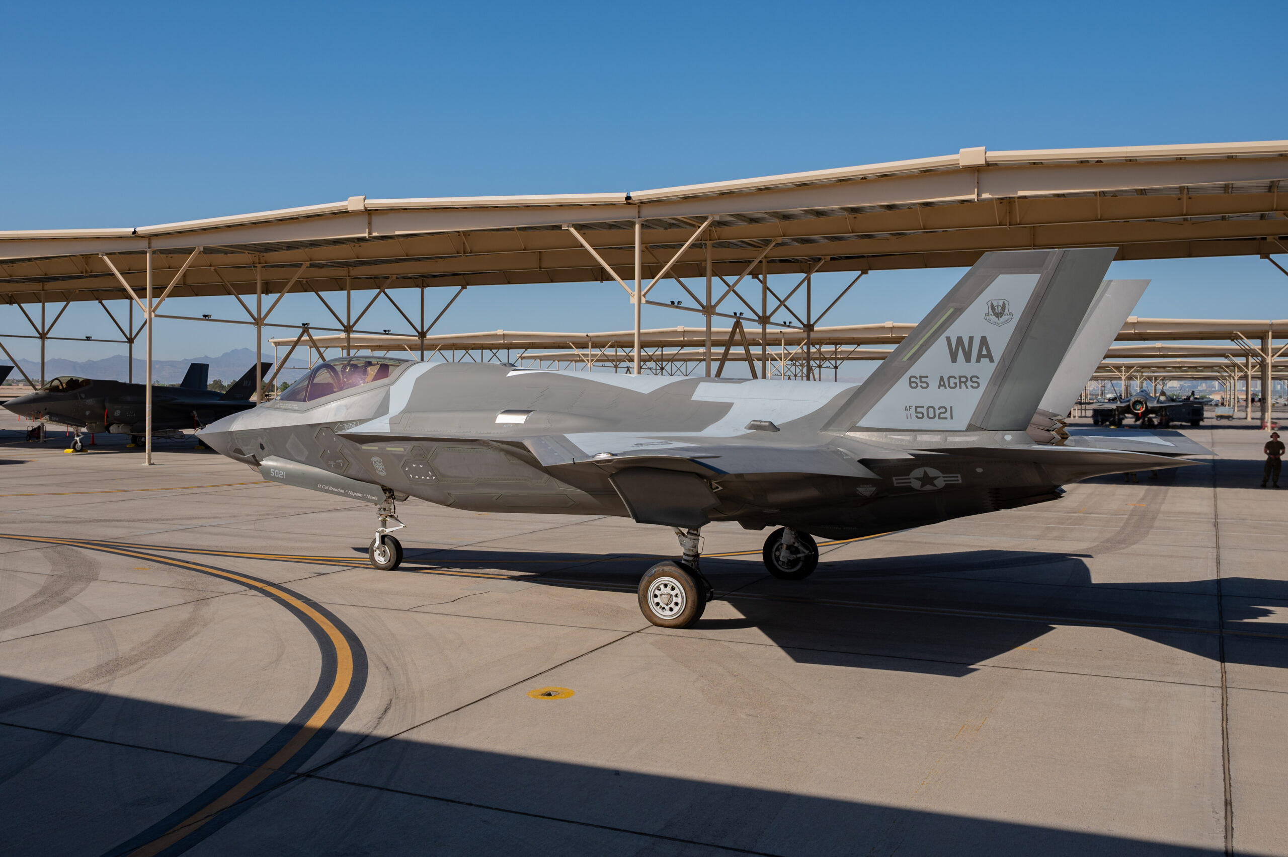 An F-35A Lightning II assigned to the 65th Aggressor Squadron taxis to the runway for an inaugural training mission as an Aggressor at Nellis Air Force Base, Nevada, June 9, 2022. The aggressor program began in the 1970s to provide pilots the opportunity to train against a U.S. aggressor force that replicated advanced and credible adversary tactics. Since then, the adversary capabilities have improved significantly and so did the need to replicate these threats. (U.S. Air Force photo by William R. Lewis)