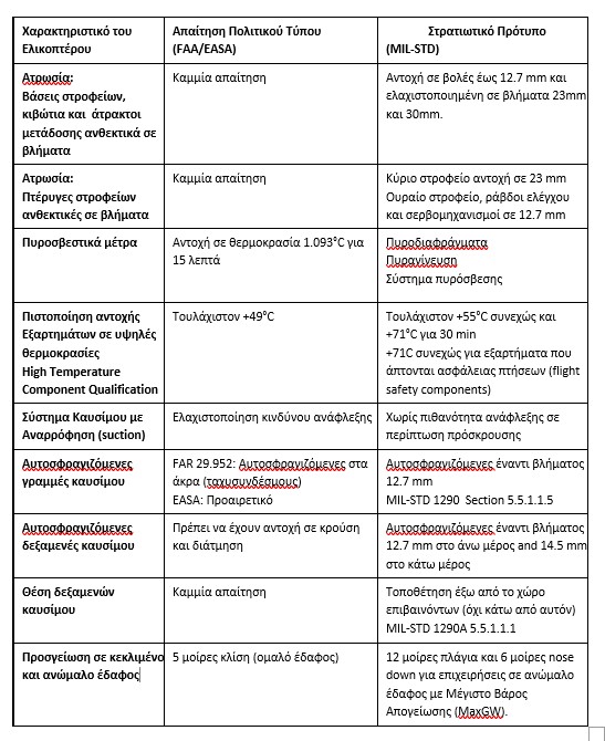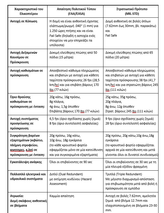 Οι διαφορές λοιπόν είναι τεράστιες. Οι στρατιωτικές προδιαγραφές (MIL-STD) απαιτούν μεγάλες αντοχές σε πλήγματα συγκεκριμένων διαμετρημάτων, αντοχή σε πολύ μεγαλύτερες επιταχύνσεις, ειδικά χαρακτηριστικά ασφαλείας και ατρωσίας, μεγαλύτερη αντοχή σε βαριά προσγείωση, ειδικές θέσεις για τις δεξαμενές καυσίμου και βέβαια αυστηρότερες δοκιμές. Οπότε η ανάπτυξη ενός στρατιωτικού ελικοπτέρου είναι πολύ απαιτητική υπόθεση και απαιτεί εμπειρία από πολυάριθμες επιχειρήσεις σε διαφορετικά θέατρα σε όλο τον πλανήτη.