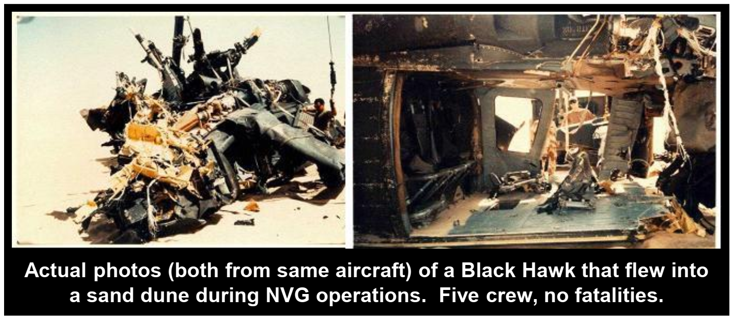 Από άλλο περιστατικό η παραπάνω φωτογραφία, δείχνει ελικόπτερο που έπεσε σε ισχυρή ανεμοθύελλα νύχτα και προσέκρουσε σε αμμόλοφο, κάτι που μάλλον θα είχε καταστρέψει ολοκληρωτικά κάθε άλλο σκάφος. Το πλήρωμα όμως διασώθηκε χάρη στην αντοχή της καμπίνας. Το περιστατικό δείχνει πως τα ελικόπτερα που έχουν σχεδιαστεί να αντέχουν τη μάχη, είναι και πιο ανθεκτικά και σε πιο “καθημερινά” ατυχήματα.