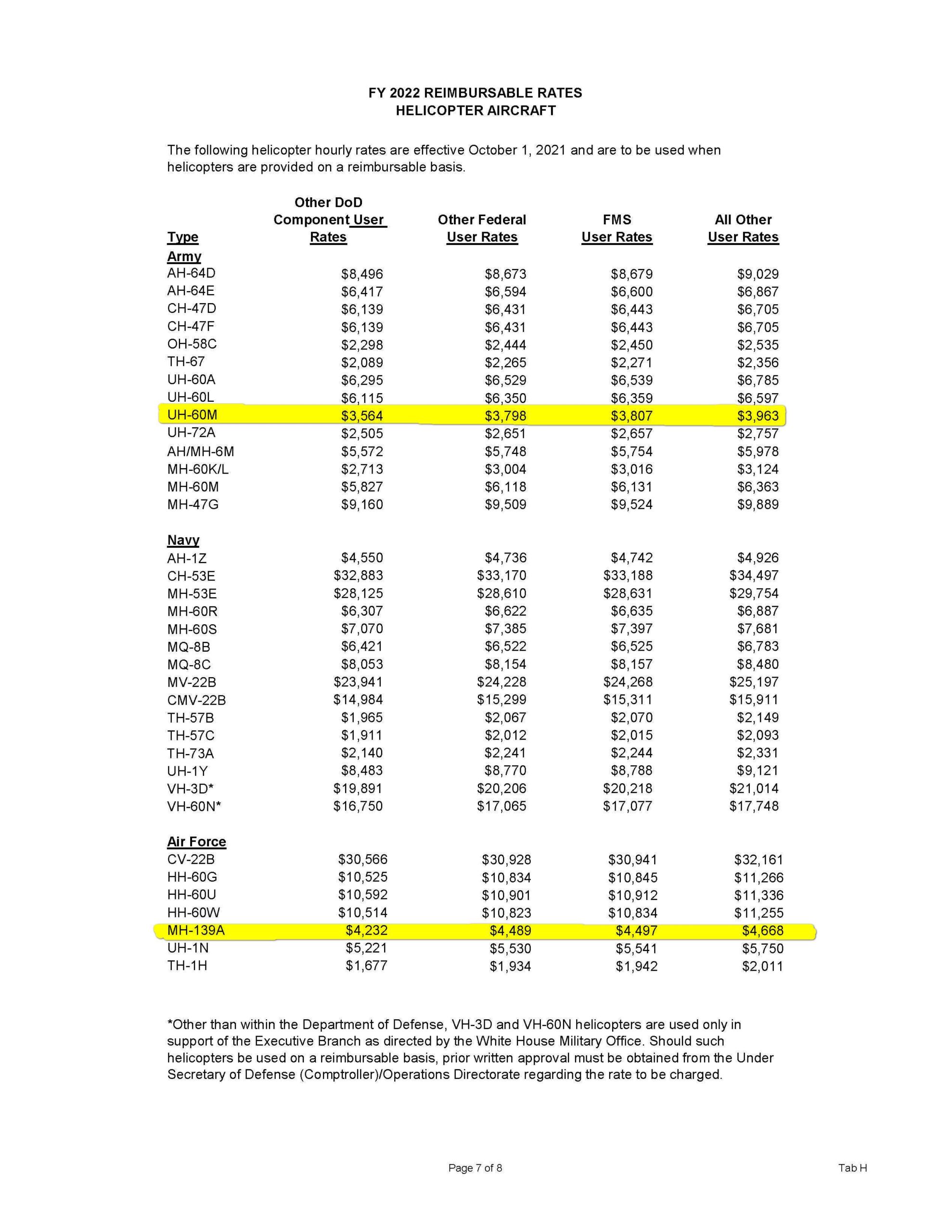 Ακόμη με βάση στοιχεία του Γενικού Ελεγκτή Προϋπολογισμού του υπουργείου Αμύνης των ΗΠΑ, για το 2022, το Κόστος ανά Ωρα Πτήσεως (ΚΩΠ) του ΜΗ-139Α είναι 4.668 δολάρια, μόλις 1.100 δολάρια λιγότερα από το απαρχαιωμένο UH-1N και 700 δολάρια υψηλότερο από αυτό του Black Hawk UH-60M, όπως φαίνεται στον επίσημο πίνακα παρακάτω (με σήμανση τα UH-60M και το AW-139).