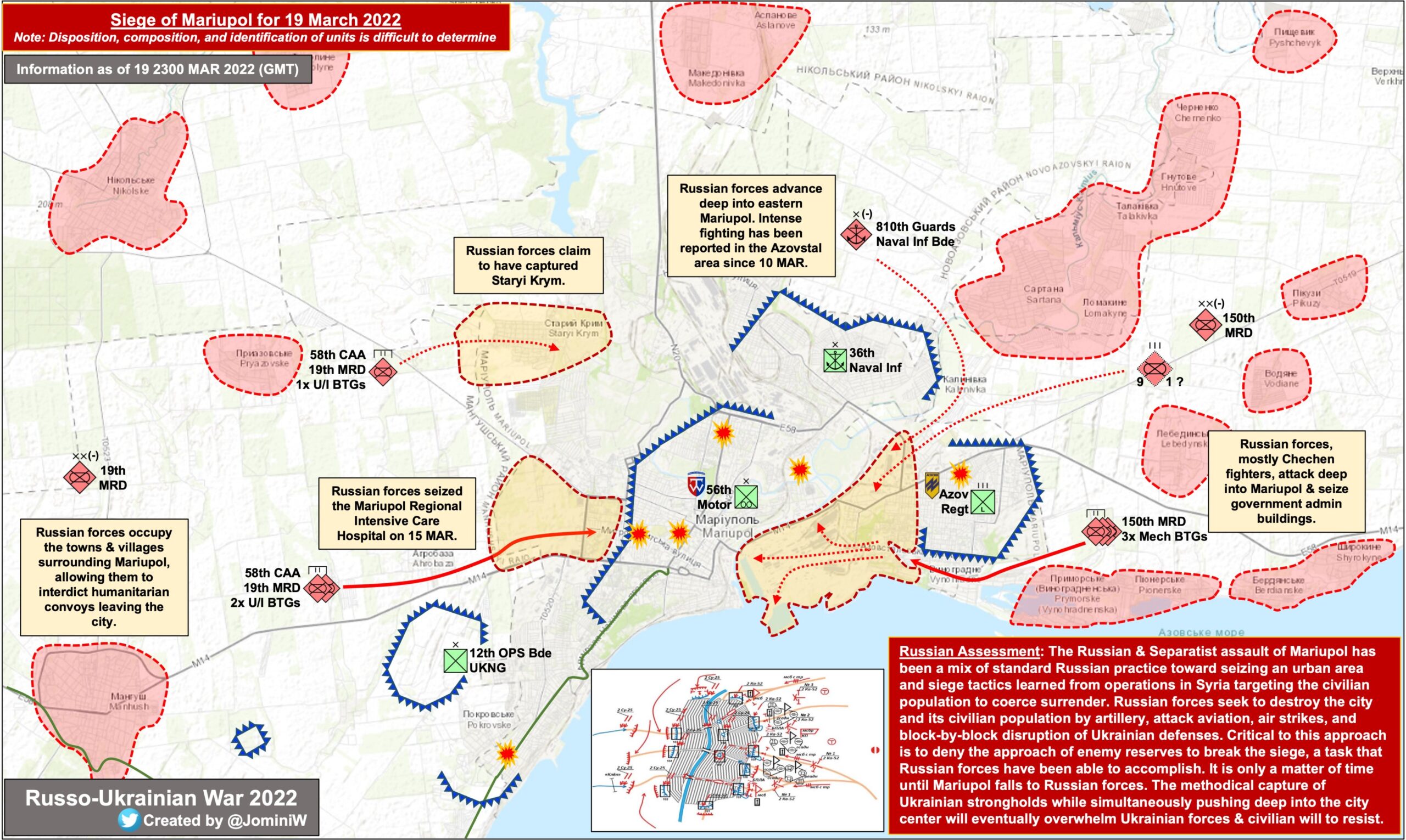 Κρίνοντας από την ανικανότητα των Ρώσων να πετύχουν μεγάλες νίκες, και με την προέλαση προς Οδησσό να έχει “κολλήσει” στο Μικολάιεφ, οι Ρώσοι στράφηκαν στον επόμενο στόχο. Με την Οδησσό σε ουκρανικά χέρια, η Ουκρανία έχει έξοδο στη θάλασσα. Αν μείνει και η Μαριούπολη στους Ουκρανούς, τότε έχουν κάνει μια “τρύπα στο νερό” κυριολεκτικά και μεταφορικά. Θα έχουν ένα “αγκάθι” μέσα στην Αζοφική, και οι Ουκρανοί θα έχουν ένα ακόμη μεγάλο λιμάνι στην Μαύρη Θάλασσα.