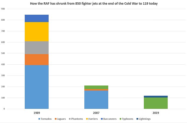 Τα ετήσια στοιχεία του βρετανικού υπουργείου Άμυνας (MoD) δείχνουν ότι η RAF είναι σήμερα μικρότερη όσο ποτέ. Το 1989, το τελευταίο έτος του Ψυχρού Πολέμου, η Βρετανία διέθετε τουλάχιστον 850 αεροσκάφη για να αντιμετωπίσει την στρατιωτική ισχύ της Σοβιετικής Ένωσης και των δορυφόρων –400 Tornado πρώτης γενιάς, περισσότερα από 100 μαχητικά/βομβαρδιστικά F-4 Phantom, πάνω από 100 αεροσκάφη εγγύς υποστήριξης Jaguar, αεροσκάφη κρούσης S.2B Buccaneer συν 170 και πλέον Harrier.
