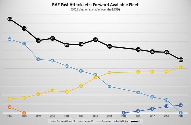 Αν και το υπουργείο αρνήθηκε να δώσει λεπτομέρειες για τον ακριβή αριθμό μαχητικών πρώτης γραμμής μετά την απόσυρση των Tornado την Άνοιξη, τα διαθέσιμα στοιχεία μαρτυρούν ότι τα μαχητικά της RAF απομειώνοντο σχεδόν σε ετήσια βάση για περισσότερο από μια δεκαετία. Στρατιωτικοί αναλυτές προειδοποιούν ότι η παράδοση της πρώτης παρτίδας (48 α/φη) από τα 138 μαχητικά F-35B που έχει δεσμευτεί να αγοράσει η Βρετανία, δεν θα έχει ολοκληρωθεί πριν το 2024, κάτι το οποίο απειλεί δυνητικά την RAF με νέο ιστορικό χαμηλό διαθεσίμων μαχητικών.
