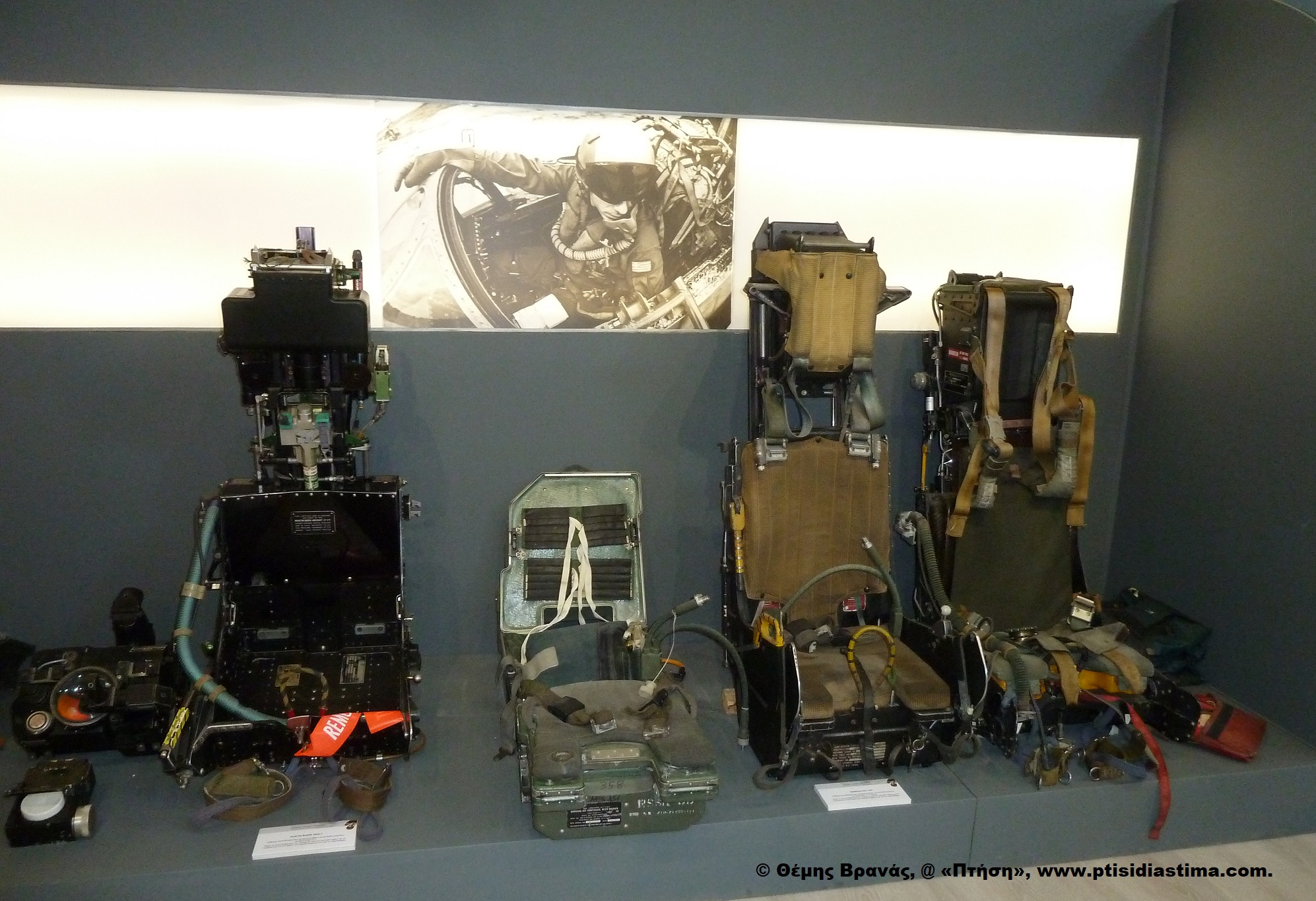 Εκτινασσόμενα καθίσματα αεροσκαφών. Από αριστερά προς τα δεξιά: Martin Baker HRQ-7 αεροσκάφους F-5A, το σπανιότατο survival pack του καθίσματος C-2 που βρίσκεται εντός του F-104G «6668», Stencel SJU-12/A αεροσκάφους A-7E, Martin Baker Mk10 αεροσκάφους F-5A.