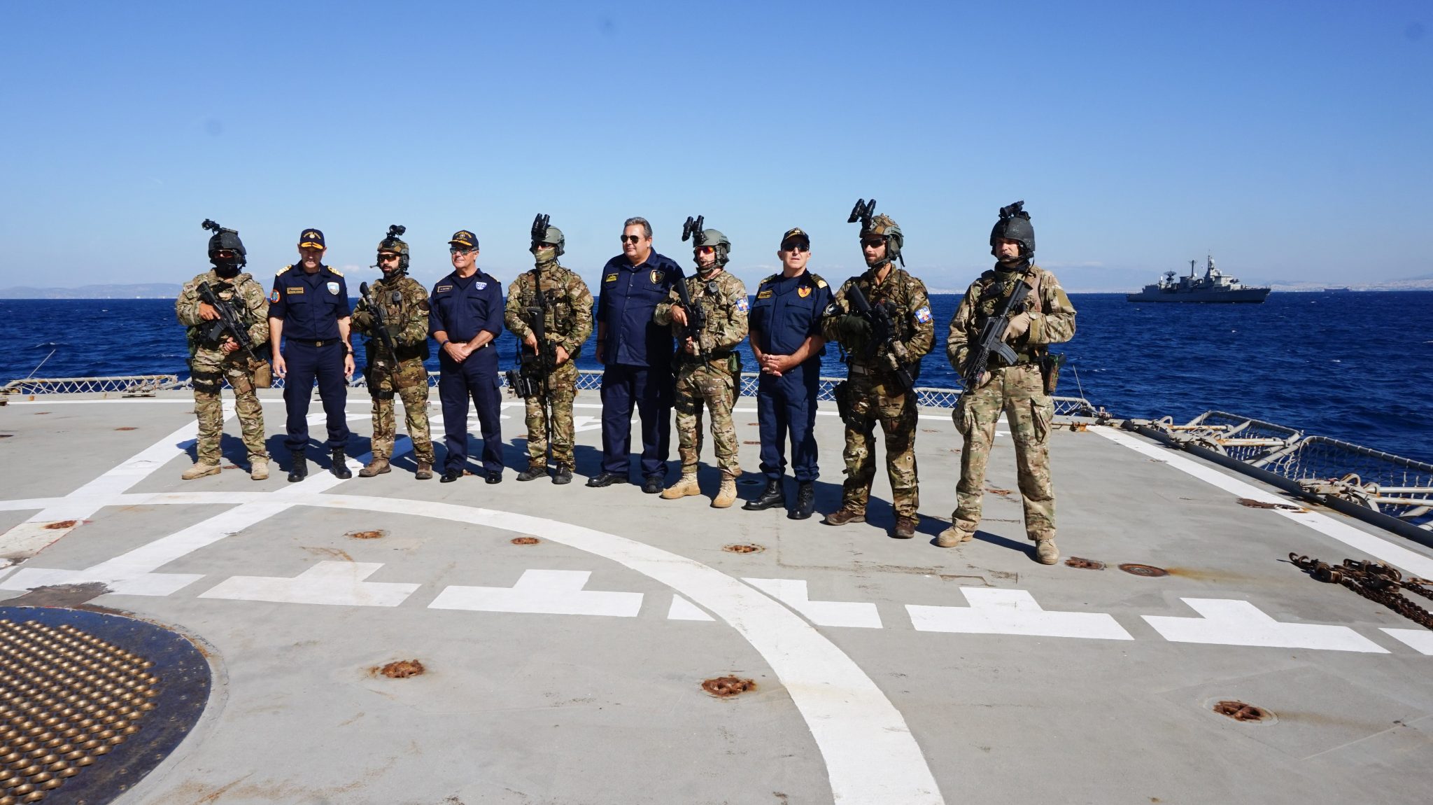 Αναλαμβάνουμε, λοιπόν, την ευθύνη μιας περιοχής, ιδιαίτερα αυτής που είναι μεταξύ της Κρήτης, του Σουέζ, της Κύπρου και της Μάλτας, όπου γίνεται η μεγαλύτερη διακίνηση παράνομων όπλων, πετρελαίου, ναρκωτικών, που χρηματοδοτεί την τρομοκρατία. Άρα αναλαμβάνουμε έναν τομέα ευθύνης που θα πρέπει να μας βάλει μπροστά, ως μια χώρα ενήμερη στην αντιμετώπιση της τρομοκρατικής απειλής. Η δική σας εκπαίδευση, τους τελευταίους μήνες, σε θάλασσα και στεριά, θα οδηγήσει τις επόμενες εκπαιδεύσεις.