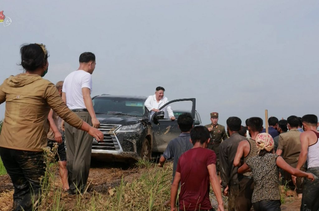 Ο Υπέρτατος Ηγέτης επισκέπτεται πλημμυροπαθείς με το αγροτικό όχημα, ένα από τα καινούργια SUV Lexus που προσέθεσε πρόσφατα τη συλλογή του.